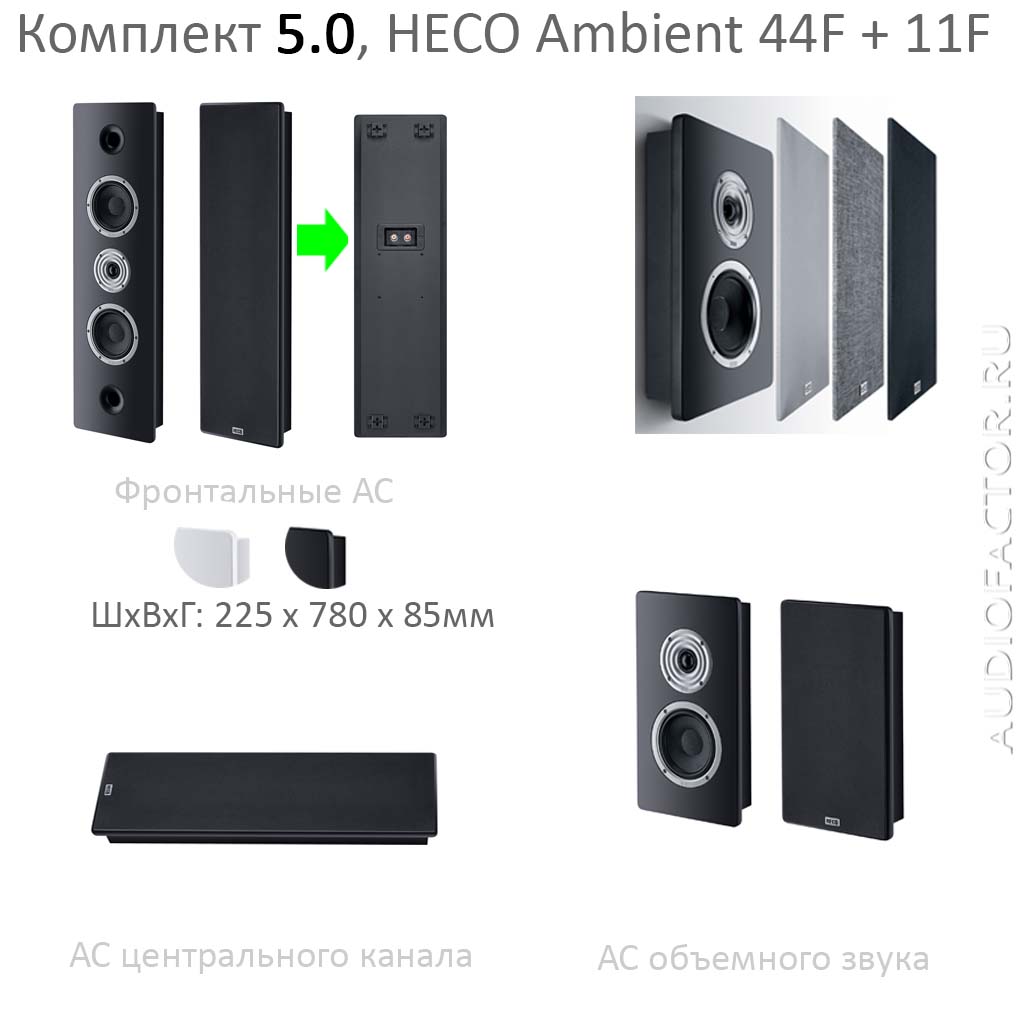 Комплект акустики для ДК 5.0 на базе настенной акустики. Состав: Фронтальные настенные АС Heco Ambient 44F + тыловые АС Ambient 11F + центр Ambient 44F. Мощность системы 180Вт. Размеры фронтальных АС (ШхВхГ): 225 х 780 х 85мм. Рекомендовано для комнат 10-30 кв. метров.