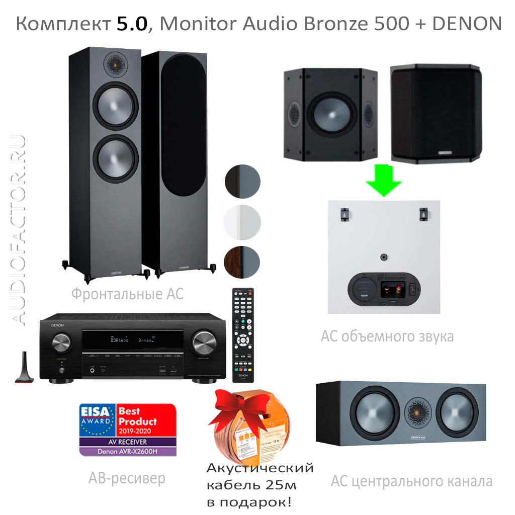 Комплект 5.0. Состав: АВ ресивер Denon AVRX2800H + фронтальные АС Monitor Audio Bronze 500 + тыловые Bronze FX + центр Bronze C150. Мощность системы 280Вт. Декодеры Dolby Digital, DTS-HD, Dolby Atmos. 8K HDMI коммутация 6 входов, 2 выхода (eARC).