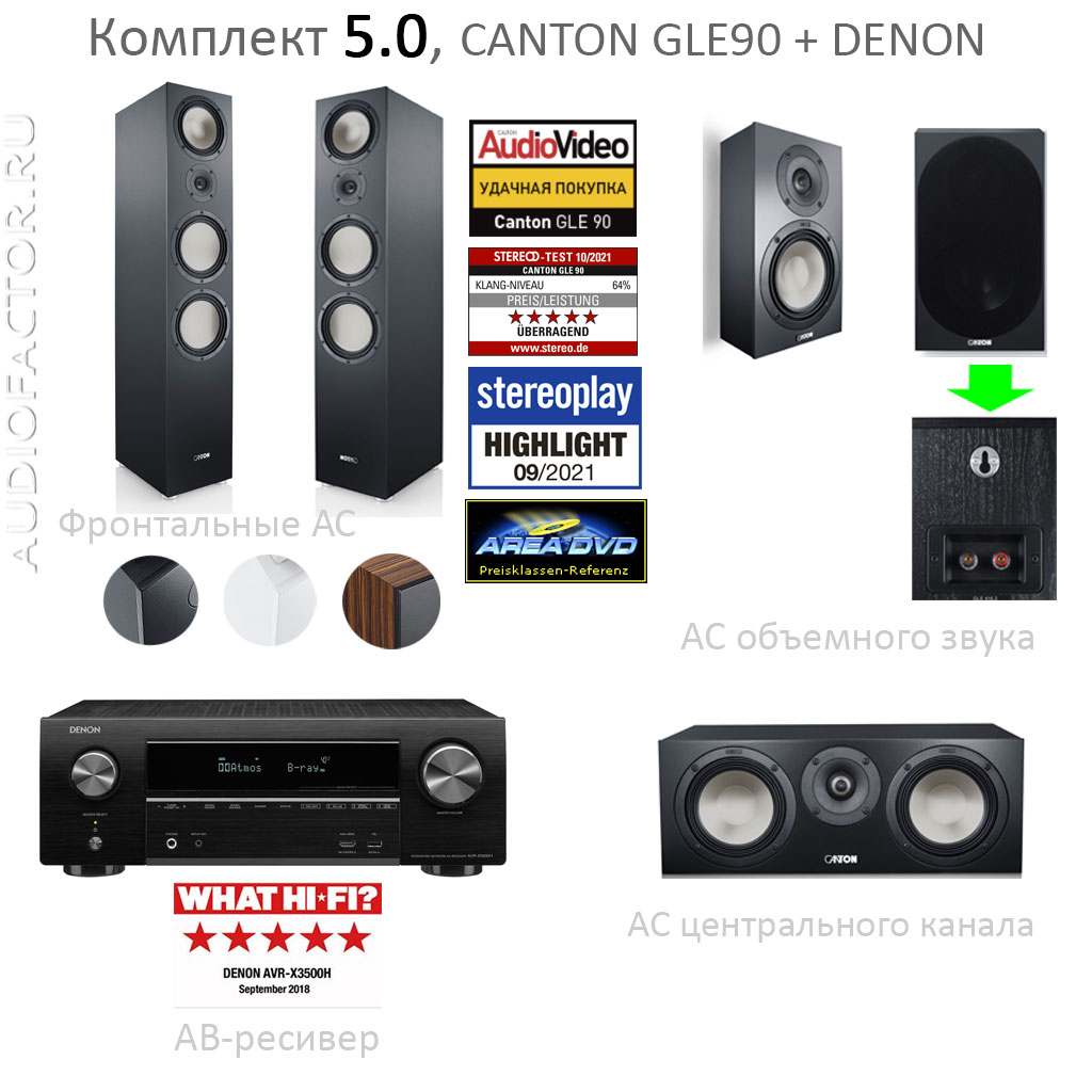 Комплект 5.0. Состав: АВ ресивер Denon AVCX3800H + фронтальные АС Canton GLE90 + тыловые АС GLE10 (GLE20) + центр GLE50. Мощность системы 330Вт. Декодеры Dolby Digital, DTS-HD, Dolby Atmos. 8K HDMI коммутация 7 входов, 3 выхода (ARC). Pre-Out выходы.