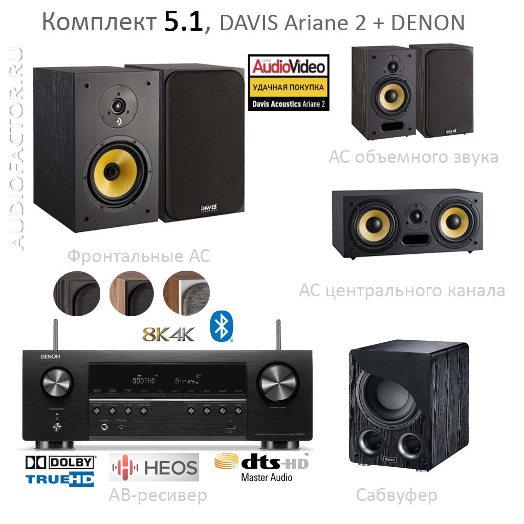 Комплект 5.1. Состав: АВ ресивер Denon AVRS670H + полочные фронтальные АС Davis Ariane 2 + тыловые АС Ariane 1 + центр Ariane C + сабвуфер Magnat RS8. Мощность системы 180Вт. Декодеры Dolby Digital, DTS-HD, Dolby Atmos. HDMI коммутация 5 входов, 1 выход (eARC).