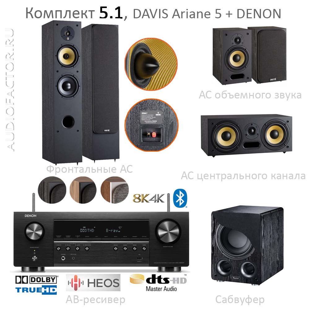 Комплект 5.1. Состав: АВ ресивер Denon AVRX1800H + фронтальные АС Davis Ariane 5 + тыловые АС Ariane 1 + центр Ariane C + сабвуфер Magnat RS8. Мощность системы 250Вт. Декодеры Dolby Digital, DTS-HD, Dolby Atmos. HDMI коммутация 6 входов, 1 выход (eARC).