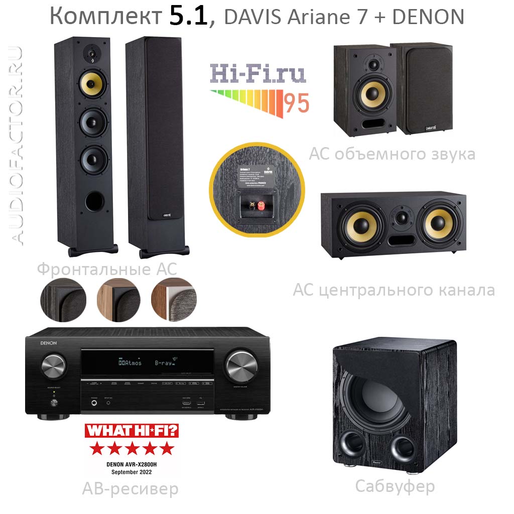 Комплект 5.1. Состав: АВ ресивер Denon AVRX2800H + фронтальные АС Davis Ariane 7 + тыловые АС Ariane 1 + центр Ariane C + сабвуфер Magnat RS12. Мощность системы 300Вт. Декодеры Dolby Digital, DTS-HD, Dolby Atmos. HDMI коммутация 6 входов, 2 выхода (eARC).