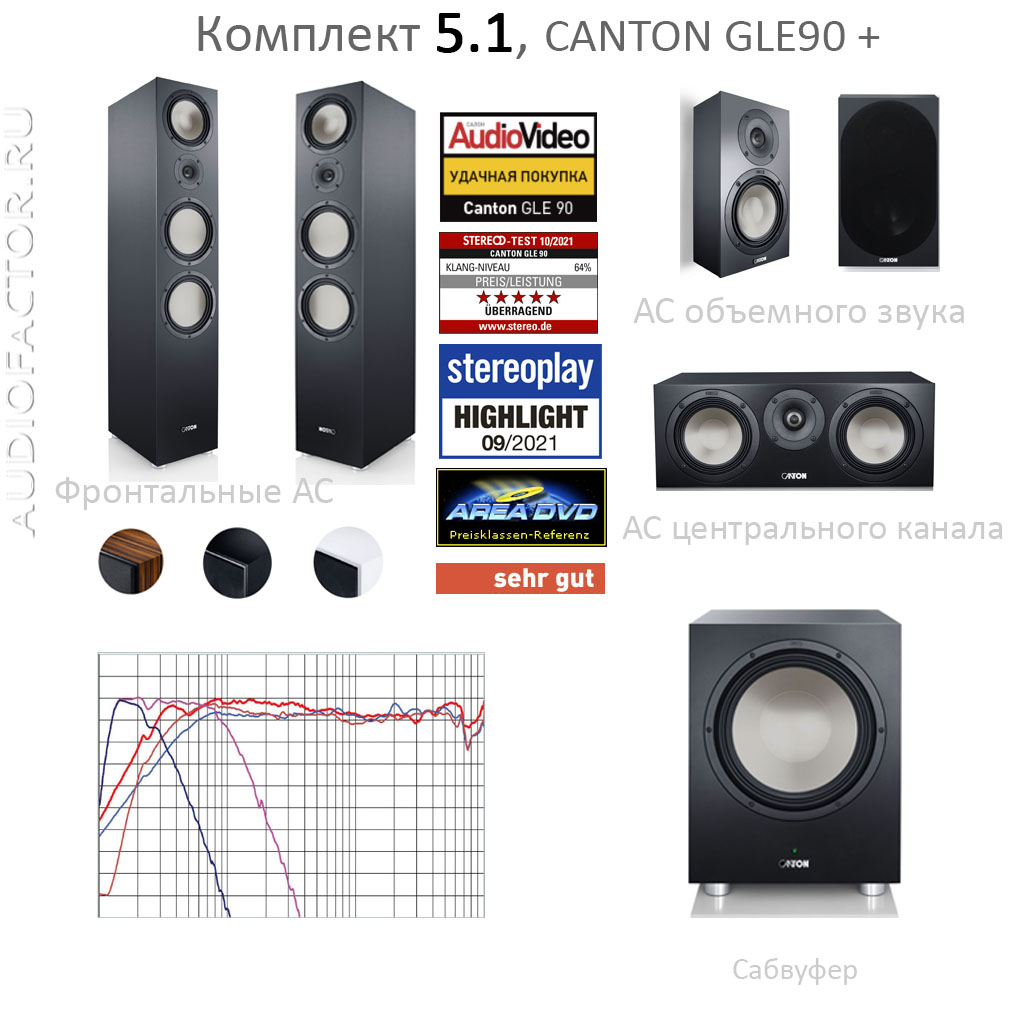 Комплект акустических систем 5.1. Состав: фронтальные АС Canton GLE90 + тыловые АС GLE10 (GLE20) + центр GLE50 + сабвуфер Canton Power Sub 10. Мощность системы 350Вт. Диафрагмы НЧ, СЧ, ВЧ динамиков из титана. Высокое качество исполнения. Сделано в Европе.
