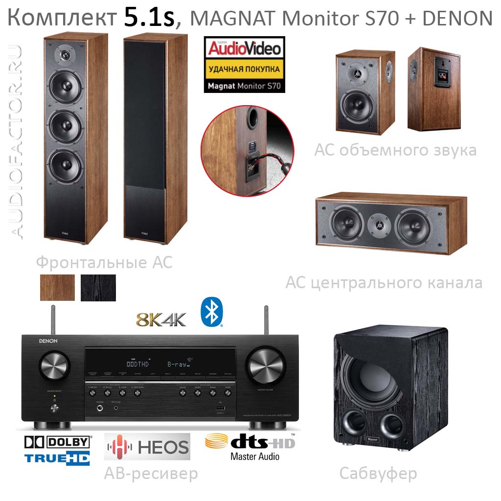 Комплект акустики 5.1. Состав: АВ-ресивер Denon AVRS670 + напольные фронтальные АС Magnat Monitor S70 + центр Monitor S12C + настенные тыловые Monitor S10D + сабвуфер Magnat Alpha RS8. Мощность системы 170Вт. Декодеры Dolby Digital, DTS-HD. HDMI коммутация 6 входов, 1 выход (ARC).