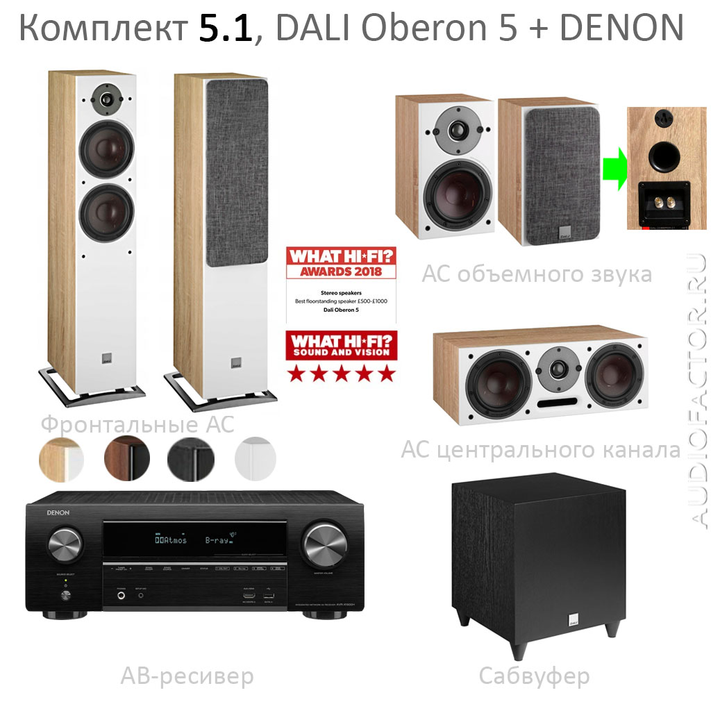 Комплект 5.1. Состав: АВ ресивер Denon AVRX1800H + фронтальные АС DALI Oberon 5 + тыловые АС DALI Oberon 1 + центр DALI Oberon Vokal + сабвуфер DALI SUB C-8D. Мощность системы 230Вт. Декодеры Dolby Digital, DTS-HD, Dolby Atmos. HDMI коммутация 6 входов, 1 выхода (ARC).