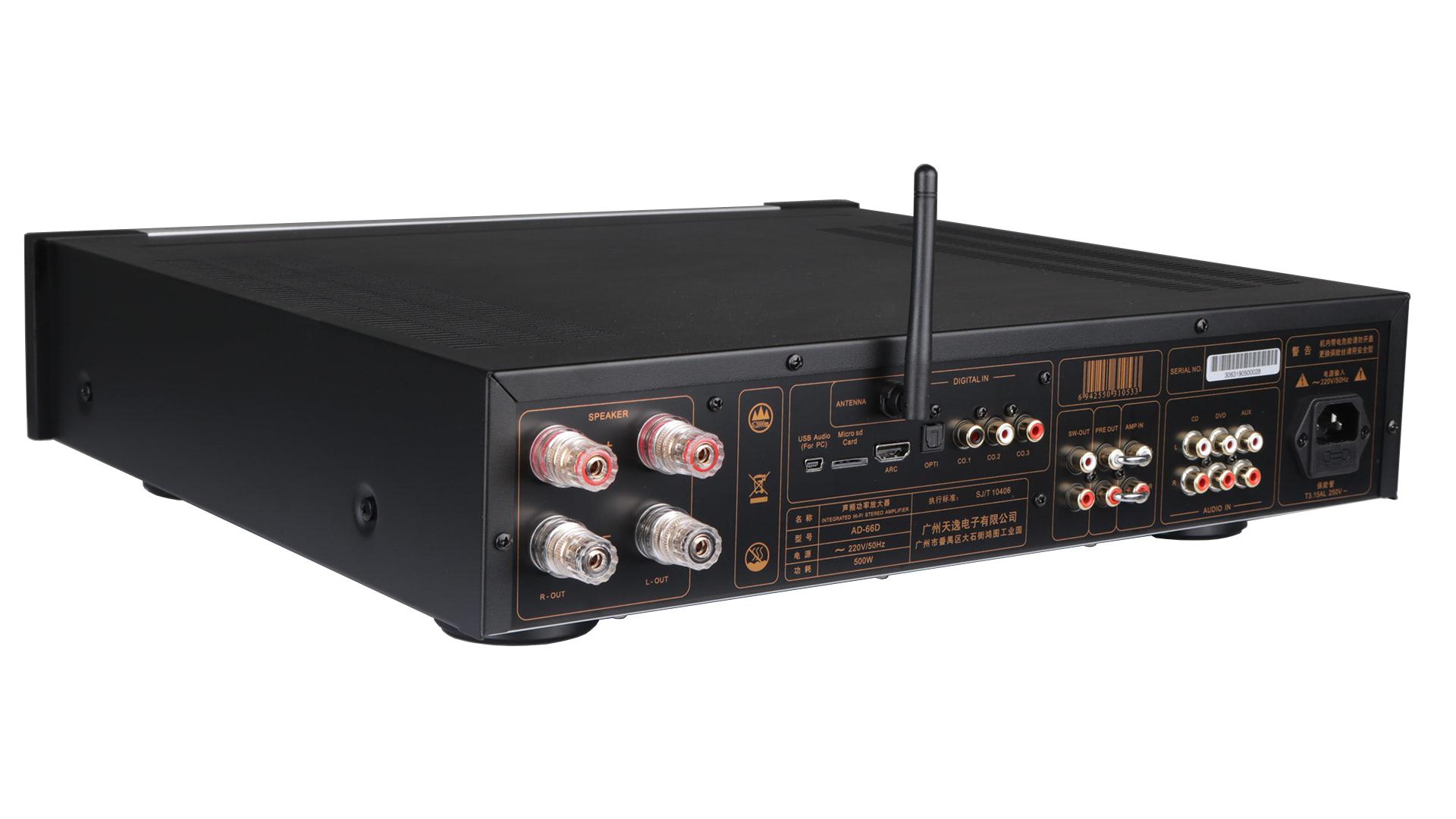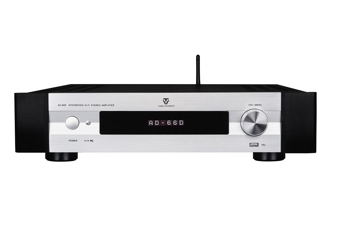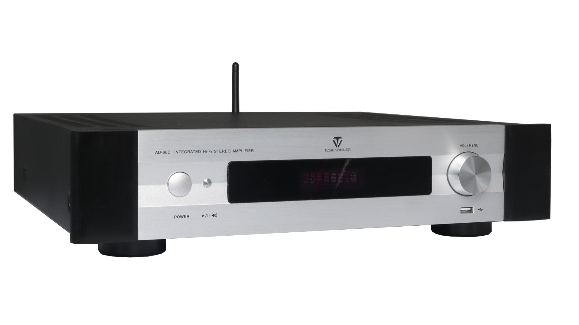 Усилитель TONE WINNER AD-66D сделан на базе профессиональной версии AD-66PRO с добавлением высококачественного аудио декодера и аудио модуля Bluetooth. В качестве ЦАПа используется аудиофильский топовый чип американской компании Analog Devices AD-1955, который имеет более высокие оценки качества, чем AD-1853, и частоту дискретизации 192 кГц при разрядности в 24 бит. ЦАП оснащен отдельной цифровой фильтрацией и цифро-аналоговой коммутацией входных и выходных сигналов, а его динамический диапазон и соотношение сигнал/шум может достигать 126 дБ, что позволяет максимально снизить степень ошибки цифрового потока данных при синхронизации. Даже обычный CD сигнал, декодированный с помощью этого ЦАП, преобразуется в чарующее звучание. Обладая такими характеристиками, как низкий уровень искажений и шума, высоким разрешением, он имеет регулировку тембра, а его дифференциальный выход подключается к регулятору громкости с шагом 0,5 дБ с применением микросхемы Japan Radio Company NJW1194 для управления входом источника звука. Цифровое ядро этой микросхемы выполняет фильтрацию, регулировку громкости и контроль уровня входного сигнала. Большой объем в блоке питания усилителя мощности занимают конденсаторы емкостью 12000 мкФ, специально изготовленные для TONE WINNER, а выходной каскад оснащен высокоскоростными транзисторами Toshiba (150 Вт). Эксплуатационная надежность схемы с низким значением КНИ и высокой скоростью нарастания и впечатляющая конструкция, вмещающая новейшие технологии производства, имеют критически важную значимость в точности передачи всех параметров исходного материала, поэтому усилитель AD-66D обладает выдающимися музыкальными возможностями.