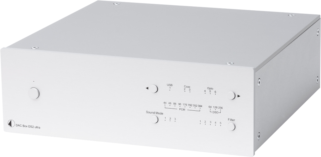 Pro-Ject DAC BOX DS2 Ultra представляет собой современный универсальный ЦАП, рассчитанный на работу с различными источниками сигнала. Аппарат оснащен USB-входом, на который можно подавать PCM-сигнал c частотой до 768 кГц и DSD до 11,2 МГц, а также коаксиальными и оптическими входами. В ЦАП-е имеется переключаемый цифровой фильтр, позволяющий подобрать оптимальные характеристики обработки различного музыкального сигнала, а также трехрежимная настройка характера звучания. DAC BOX DS2 Ultra отличается минимальными шумами и искажениями, а внешний штатный блок питания при желании может быть заменен на улучшенный Power Box DS2 Source.