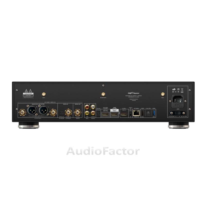 Zappiti Signature поддерживает большинство цифровых аудио- и видеоформатов, включая современные 4K HDR стандарты Dolby Vision и HDR10+, отображает полноценные меню BD/UHD, работает с видеокодеками HEVC (1 миллиард цветов и 10-битное цветовое пространство), VP-9, совместим со стандартами 3D-видео и 3D-субтитрами, читает аудиофайлы высокого разрешения DSD, FLAC, ALAC и MQA. Он собран в солидном и прочном корпусе, имеет два выхода HDMI, поддерживает форматы 4K 60p, Dolby Atmos и DTS:X — благодаря чему позволяет получить наилучшие впечатления от использования домашнего кинотеатра. Также Zappiti Signature оснащен профессиональным ЦАПом (ESS9038 PRO), ультранизкоджиттерным и производительным аудиопроцессором XMOS XU216, обеспечивает обработку аудиопотока с побитовой точностью, имеет режим "Direct DSD", оснащен двумя высококлассными трансформаторами питания R-Core с раздельными цепями для цифровых и аналоговых схем, премиальными балансными разъемами XLR, усилителем для наушников с выходом 6.35 мм и OLED-дисплеем, позволяющим управлять плеером без подключения к телевизору.