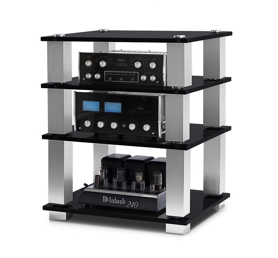 Стойка для Hi-Fi компонентов. 4 полки из закаленного стекла (19мм). Алюминиевая модульная конструкция. Расстояние между полками 180/ 200/ 280мм. Размеры (ШхВхГ): 804х710х590мм.