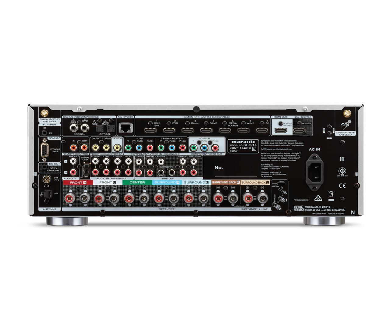 Имеется восемь HDMI входов (один HDMI вход на передней панели для быстрого подключения), каждый их которых поддерживает HDCP 2.3, 4K Ultra HD 60Hz видео, кодирование цвета 4:4:4 Pure Color, Dolby Vision, HLG, High Dynamic Range (HDR10) и 21:9 видео, сквозной пропуск 3D и BT.2020. Видео процессор масштабирует SD и HD видео до 4K Ultra HD. HDMI входы автоматически переименовываются при поступлении информации от источников. Имеются также два HDMI выхода.