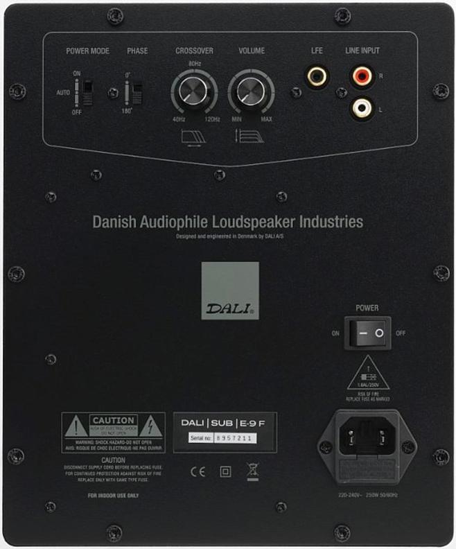 На задней панели SUB E-9 F размещены органы регулировки громкости, фазы и верхней частоты среза, а функция power on/off автоматически включает его при обнаружении сигнала. Имея как LFE, так и LINE входы, сабвуфер легко вписывается в любую AV систему.