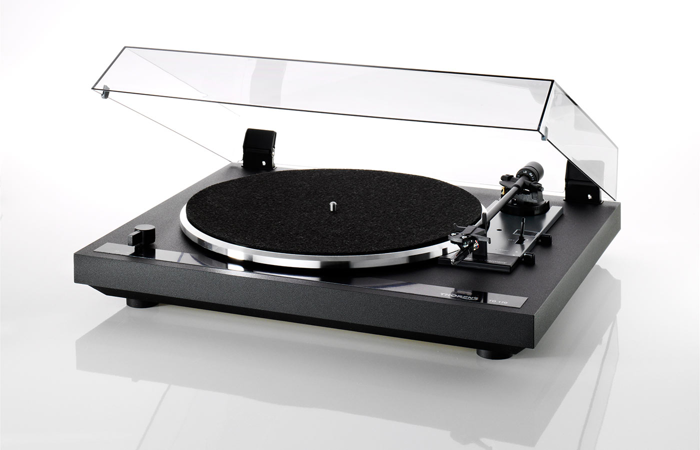 Опорный диск проигрывателя изготовлен из алюминия и имеет облегченную конструкцию, а также очень точно сбалансирован. Аппарат имеет демпфирующий мат для защиты пластинки от вибраций. Двигатель постоянного тока, соединенный с диском с помощью пассика, обладает низким уровнем шумов и подключен к блоку питания, обеспечивающему точную стабилизацию скорости его вращения. Thorens TD 170 EV имеет электронное переключение скорости вращение диска (33, 45 и 78 об/мин), что также очень удобно.