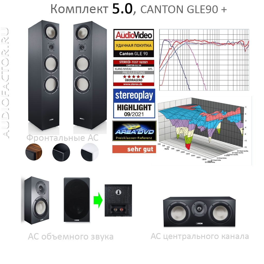 Комплект акустических систем 5.0. Состав: фронтальные АС Canton GLE90 + тыловые АС GLE10 (GLE20) + центр GLE50. Мощность системы 330Вт. Диафрагмы НЧ, СЧ, ВЧ динамиков из титана. Высокое качество исполнения. Сделано в Европе.