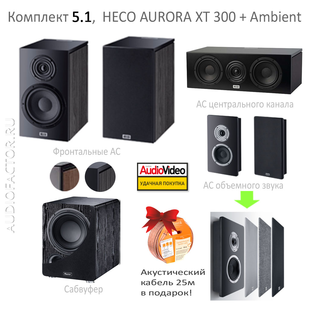Комплект акустики 5.1. Состав: Полочные фронтальные АС Heco Aurora XT 300 + центр Aurora XT Center + настенные тыловые Heco Ambient 11F + активный сабвуфер Magnat RS8. Мощность системы 180Вт.
