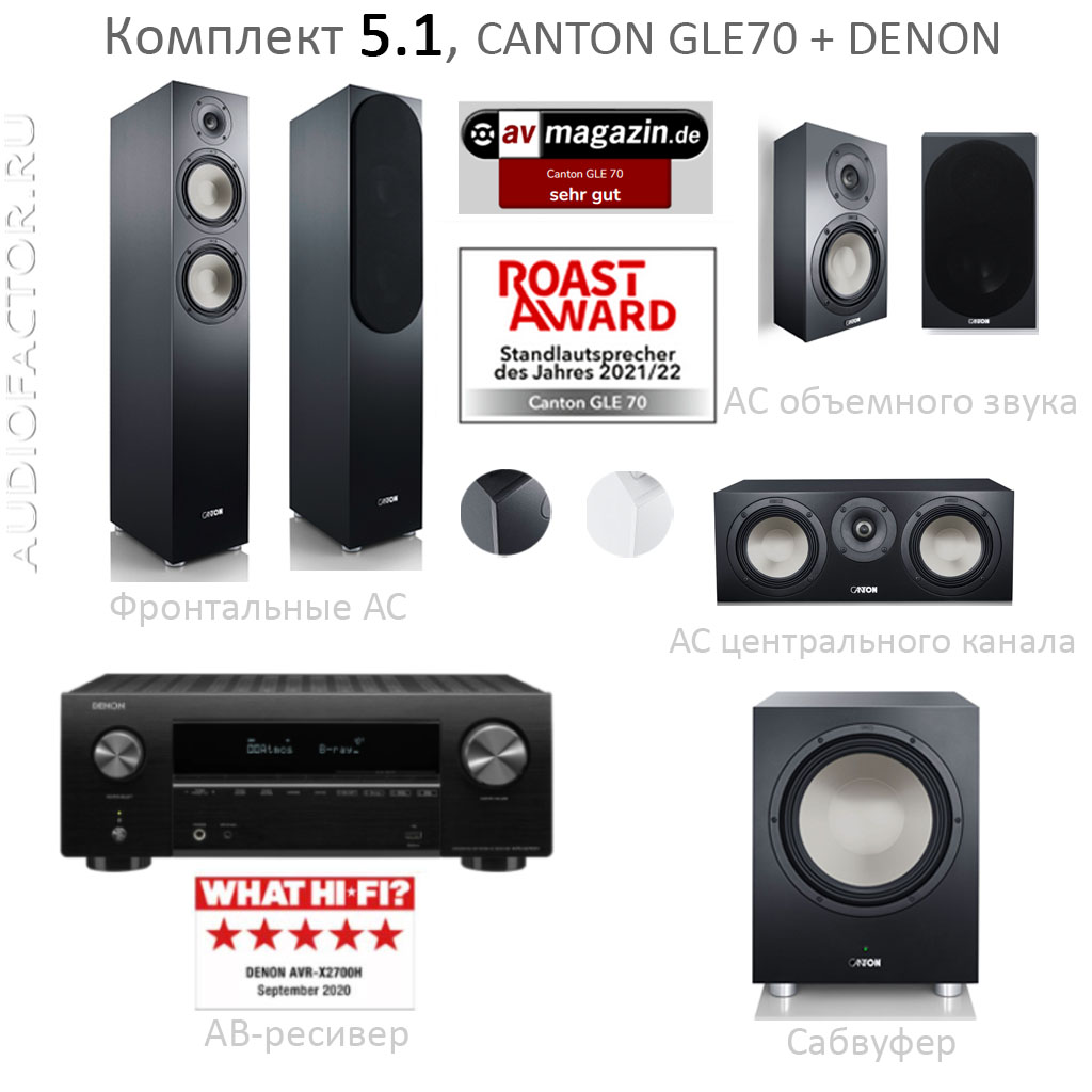 Комплект 5.1. Состав: АВ ресивер Denon AVRX2800H + фронтальные АС Canton GLE70 + тыловые АС GLE10 (GLE20) + центр GLE50 + сабвуфер Canton Power Sub 10. Мощность системы 200Вт. Декодеры Dolby Digital, DTS-HD, Dolby Atmos. HDMI коммутация 6 входов, 2 выхода (ARC). Рекомендовано для комнат 12-25 кв. метров.