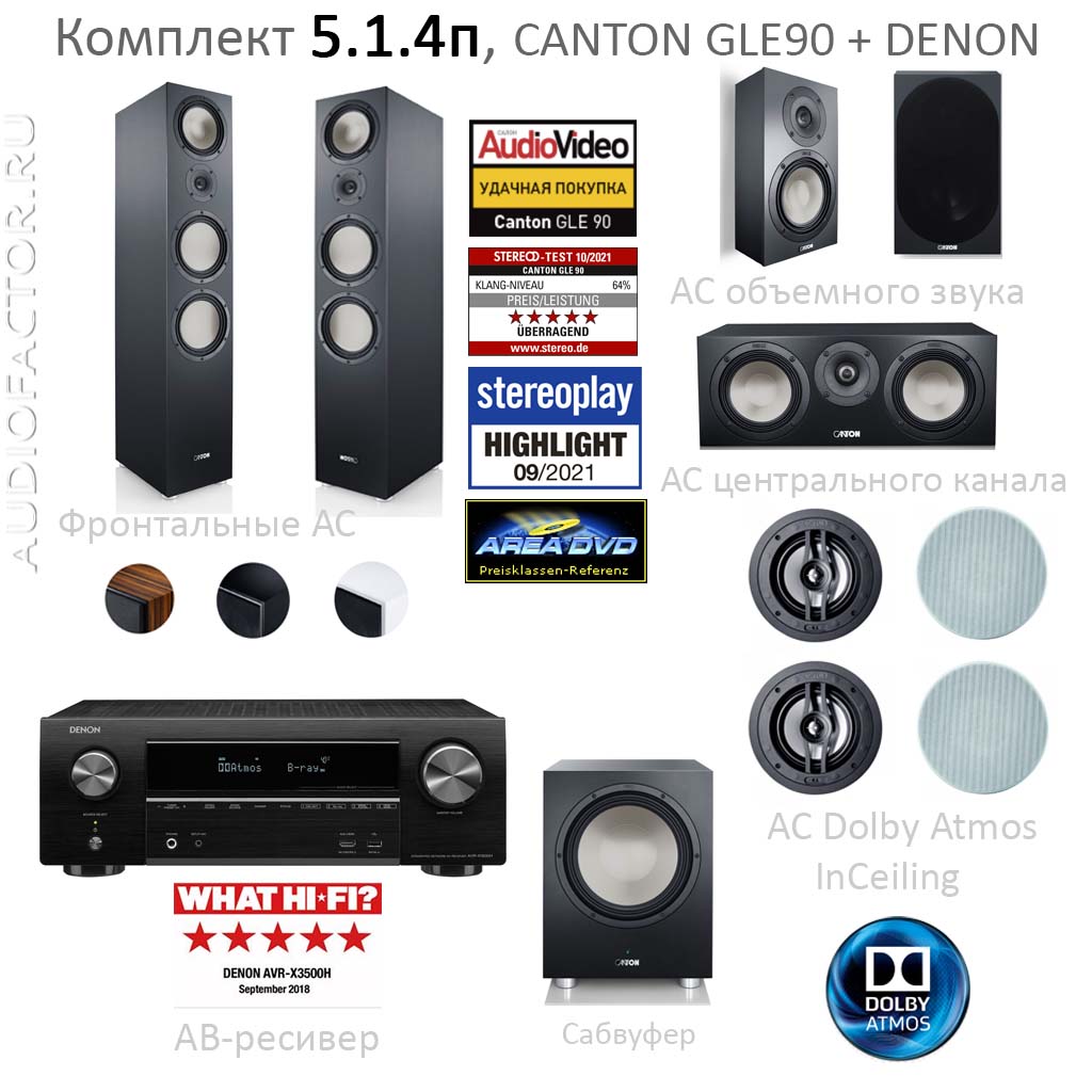 Комплект премиум класса для формата Dolby Atmos 5.1.4п. Состав: АВ-усилитель Denon AVCX3800H + фронтальные АС Canton GLE90 + тыловые GLE10 + центр GLE50 + АС Atmos Canton INC865 + сабвуфер Canton Power Sub 10. Мощность системы 350Вт. Декодеры Dolby Digital Plus, Auro-3D, Dolby Atmos, DTS-X. HDMI коммутация 7 входов, 3 выхода (eARC).
