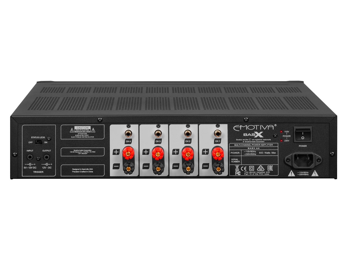 BasX A4 представляет собой четырехканальный усилитель мощности 100 Вт/канал на 8 Ом и 130 Вт/канал на 4 Ом (нагружены все каналы) с номинальным значением КНИ+Ш < 0,02% и отношением сигнал/шум 115 дБ по шкале А. Он имеет массивный встроенный источник питания, высококачественную схему усиления класса A/B, защиту от сбоев, не оказывающую влияние на сигнал, а также триггерные вход и выход. Высококачественные несимметричные входы с разъемами RCA промышленного стандарта позволяют использовать BasX A4 практически с любым предусилителем или процессором, а акустические клеммы аудиофильского уровня с пятивариантным подключением предусматривают использование штекеров типа «банан», коннекторов типа «лопатка» или просто оголенных проводов. В совокупности эти особенности обеспечивают отличные характеристики и по-настоящему высокое качество звука BasX A4 при его на удивление доступной цене.