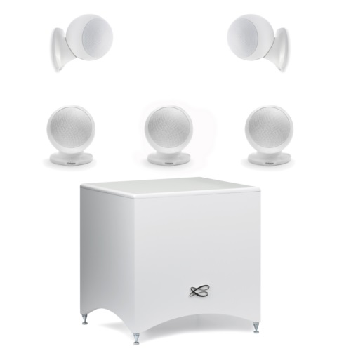 Комплект акустики 5.1 для домашнего кинотеатра. В составе 5 шарообразных сателлита (диаметр 10см) и плоский сабвуфер, мощностью 100/200Вт. Возможность установки на полку, крепления на стену и врезка в потолок.