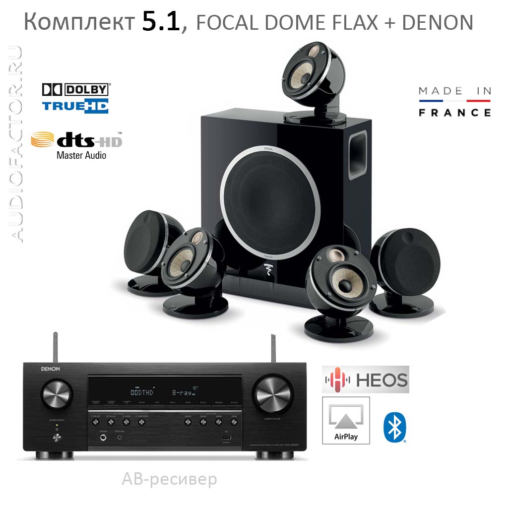 Комплект 5.1. Состав: сетевой АВ ресивер Denon AVRX1800H + набор акустических систем 5.1 Focal Dome Flax. Мощность системы 150Вт. Декодеры Dolby Digital, DTS-HD. HDMI коммутация: 6 входов, 1 выход (eARC). Автонастройка Audyssey. USB вход. AirPlay, Bluetooth интерфейс. Встроенный плеер HEOS. Рекомендовано для комнат 16-35 кв. метров.