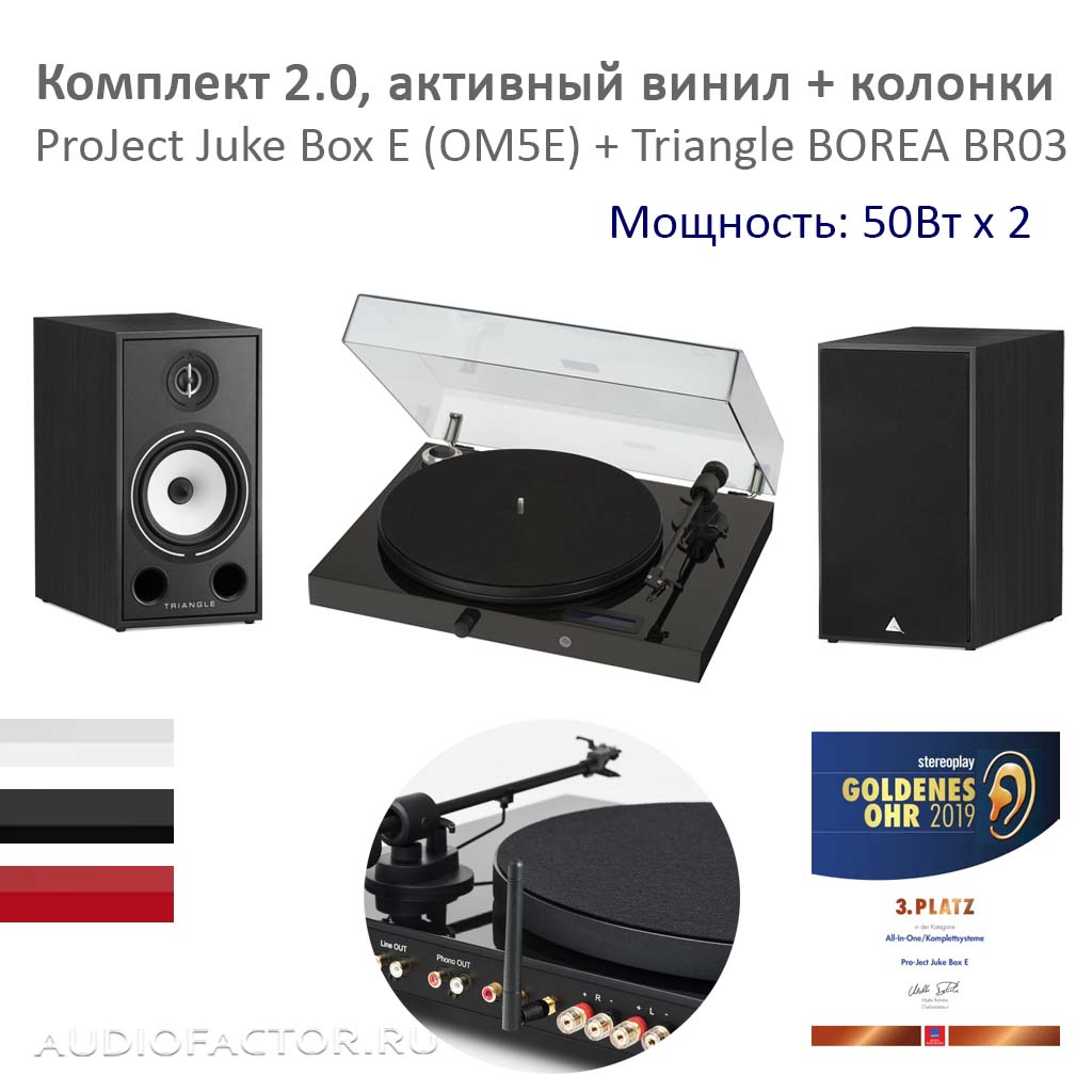 Комплект: винил с усилителм + колонки. Состав: проигрыватель виниловых пластинок Pro Ject JukeBox E + полочная акустика Triangle Borea BR03. Музыкальная мощность 50 Вт х 2. Диапазон 46Гц-22кГц. Цвет черный.