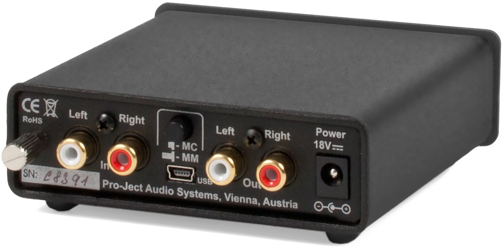 Поверхности разъемов на задней панели Pro-Ject Phono Box USB имеют позолоченные контактные поверхности, а внешний блок питания отличается минимальной потребляемой мощностью при «простое» устройства. Входные параметры предусилителя подобраны таким образом, чтобы оптимально согласовываться с импедансом большинства популярных моделей головой. Специальный переключатель служит для выбора типа подключенного звукоснимателя.
