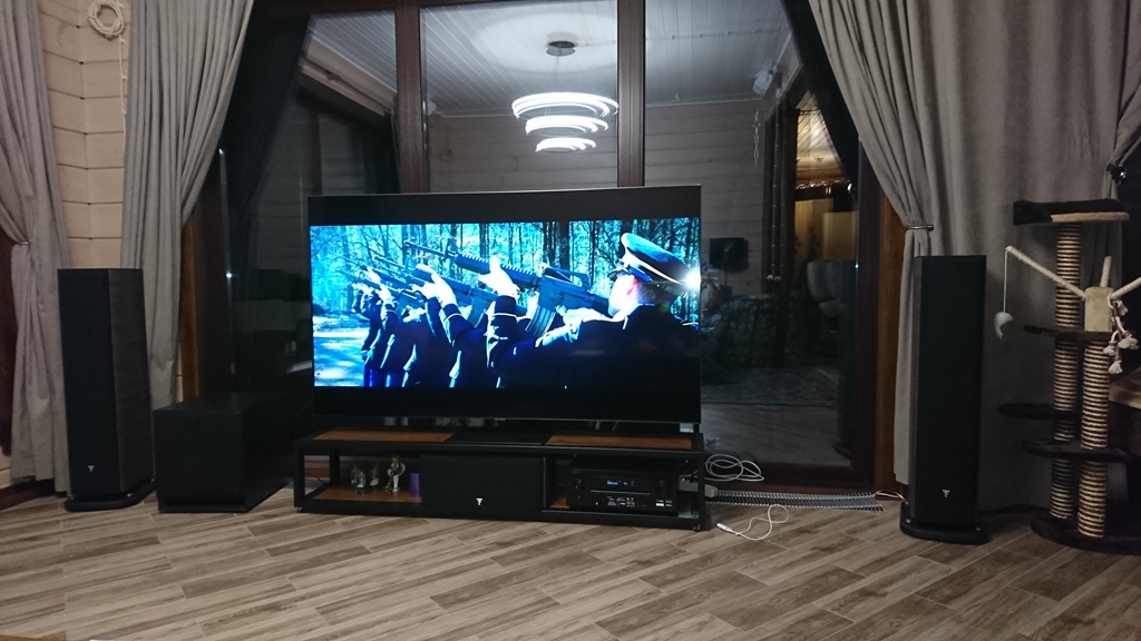 В качестве основных компонентов был выбран современный АВ-ресивер Denon AVR-X3600H с акустикой французской фирмы Focal, серии ARIA. Эта комбинация позволяет получить выдающееся звучание как в кинотеатре, так и в стерео режиме и в дальнейшем развивать систему, благодаря многочисленным интерфейсам. Мощный сабвуфер Klipsch SPL-120 обеспечивает басовую поддержку. В качестве акустики формата Dolby Atmos использованы поворотные колонки Canton PRO XL.3.