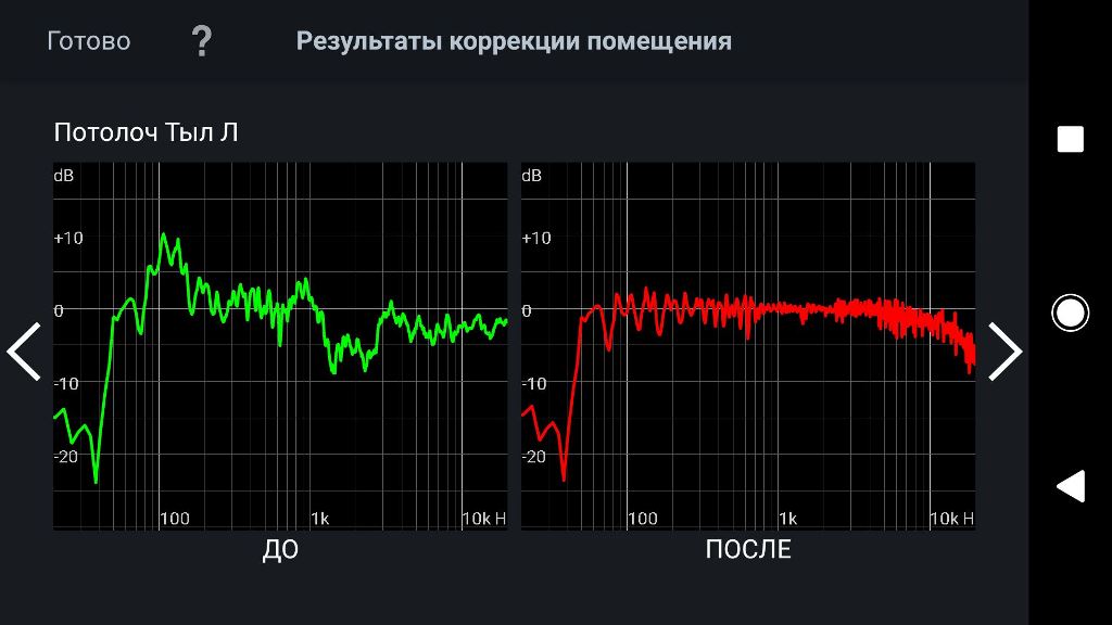 АВ-ресивер Denon AVR-X1600 имеет 7-канальную конфигурацию и декодеры Dolby Atmos и DTS-X. Использование платного приложения Audyssey MultEQ Editor позволило качественно настроить систему и видеть результаты этой настройки. Ниже на фото зеленые графики - исходные характеристики, красные графики - характеристики после настройки:
